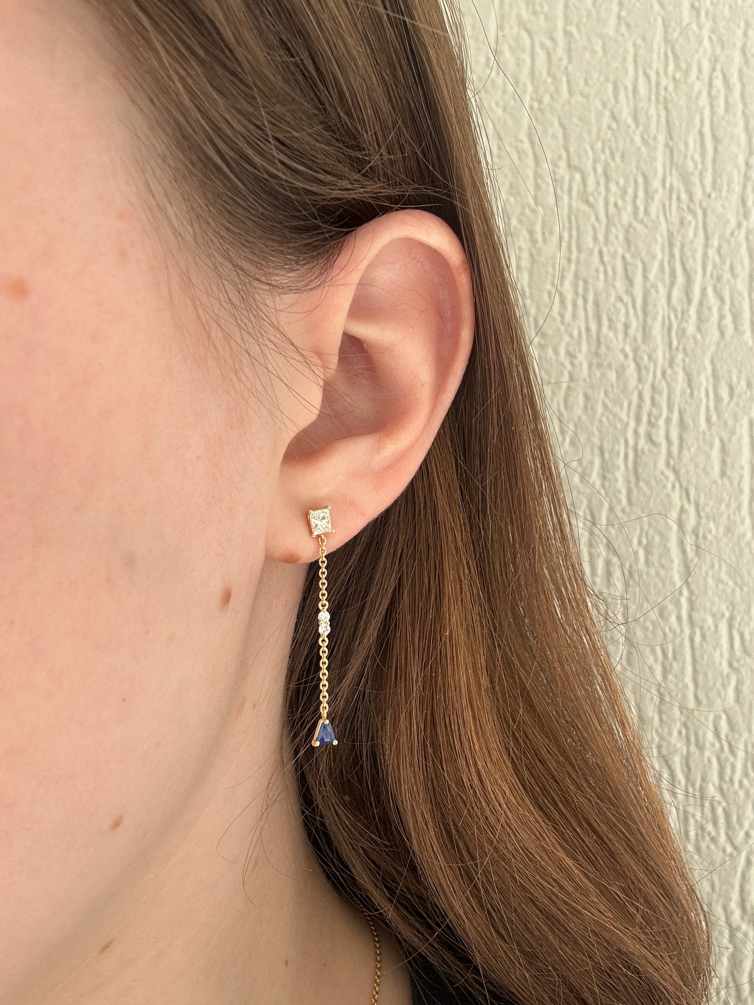 These dazzling 18ct gold earrings feature two princess cut natural white diamonds paired with delicate tapered sapphires along the chain